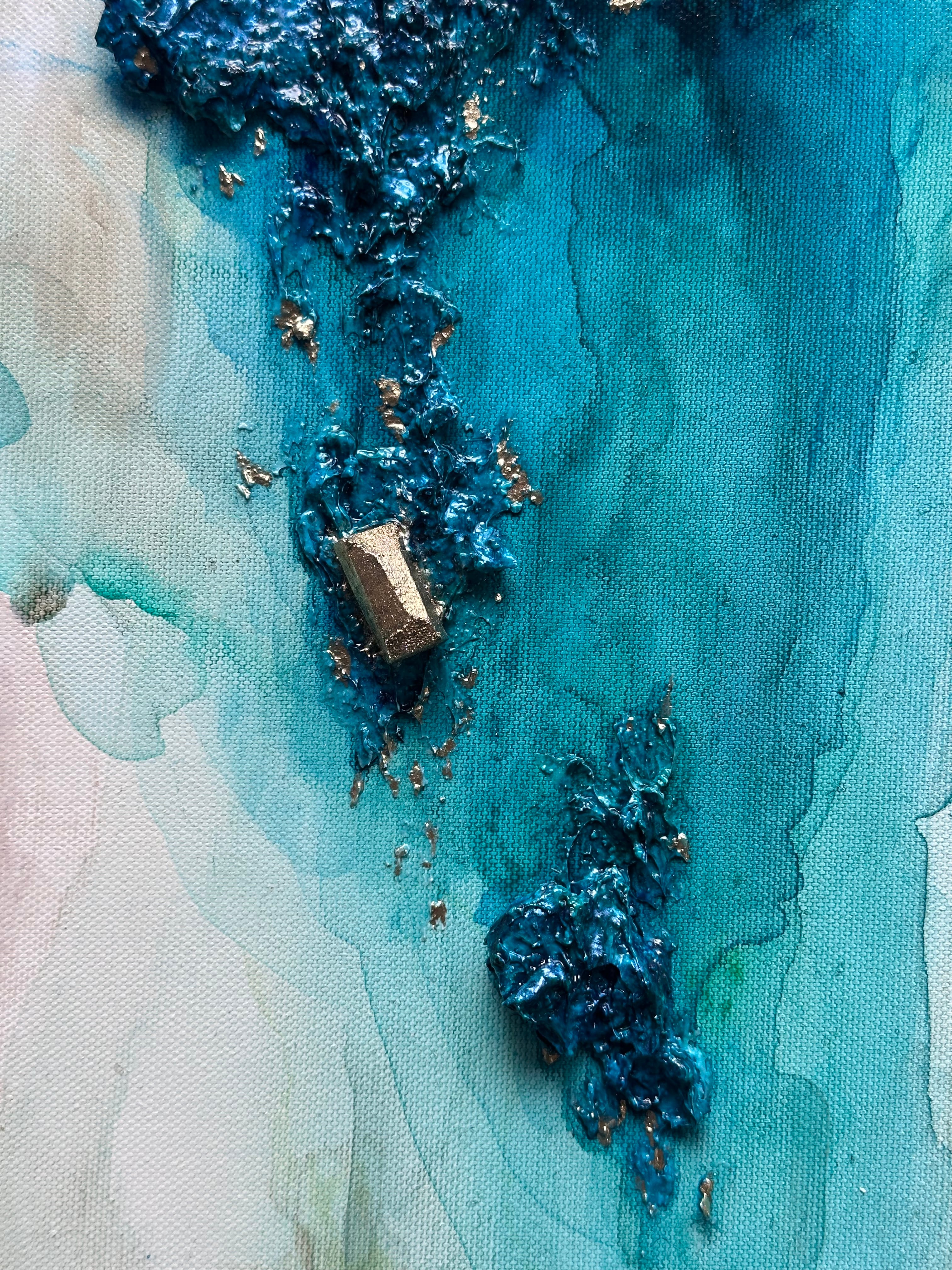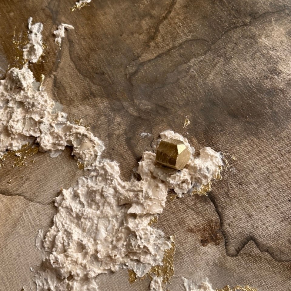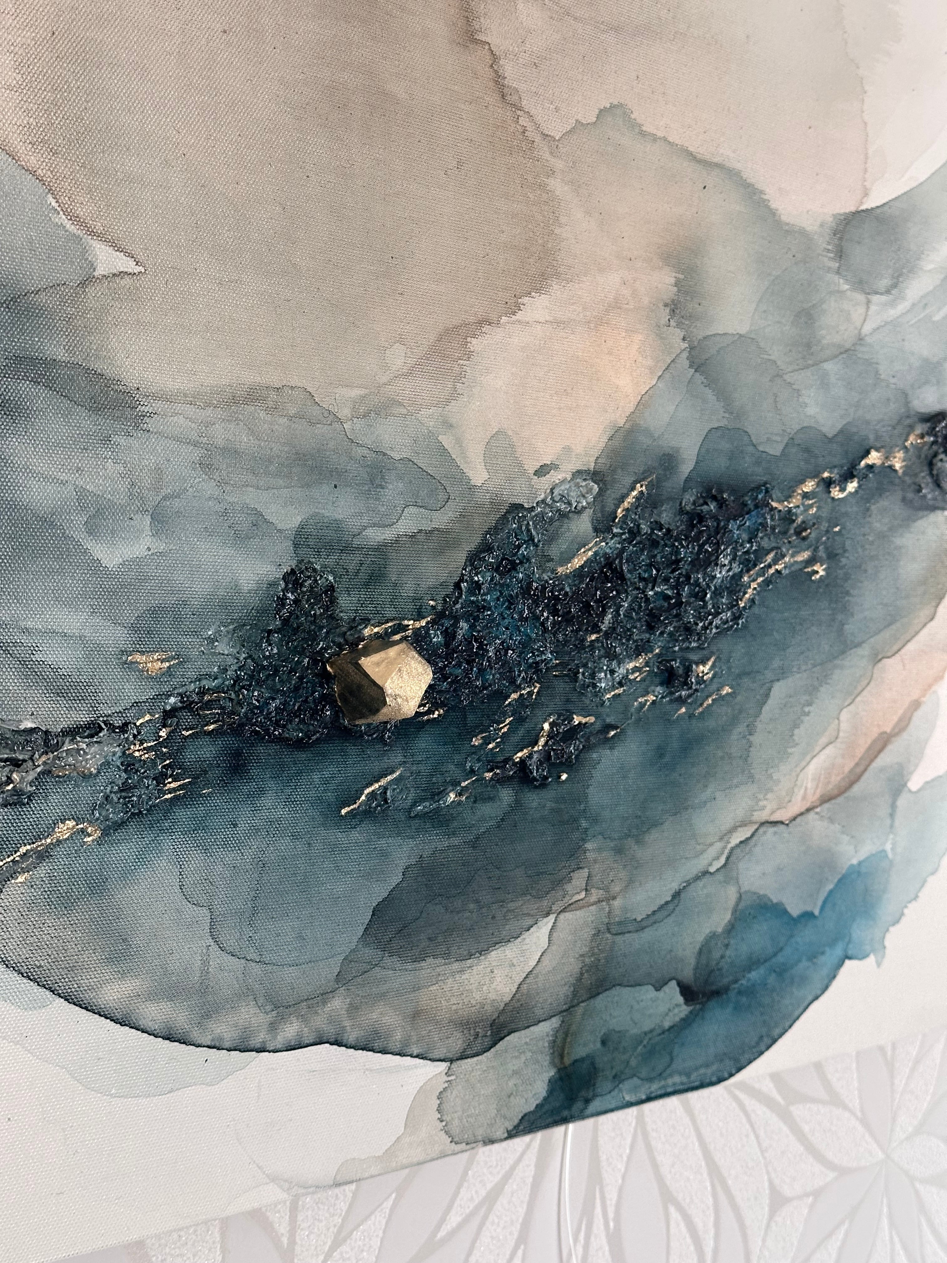 オリーブグリーンとキングスブルーを基調に制作した、ミニサイズの原画作品です。 自然の中にある色の重なりや、時間をかけて形成された鉱物や天然石の質感から着想を得ています。 天然素材を用い、絵具を重ねることで生まれる立体的な表情は、 光の当たり方によって陰影や色の深みが変化します。 厳選した金色塗料をさりげなく施し、上品なきらめきを実現しました。 鉱物を思わせる質感が調和した一点物の作品です。 小さなサイズ感のため、デスクや棚、玄関など、 スペースを取らずに気軽に飾っていただけます。 サイズ 額装サイズ:約119 × 119mm 厚み:20mm以下 素材:木製スライス、アクリル絵の具、モデリングペースト、天然素材 自然や石の質感、落ち着いた色合いがお好きな方におすすめのミニ原画です。 ※作品証明書は付属しません。 ※ご注文から発送まで2週間ほどいただきます。
